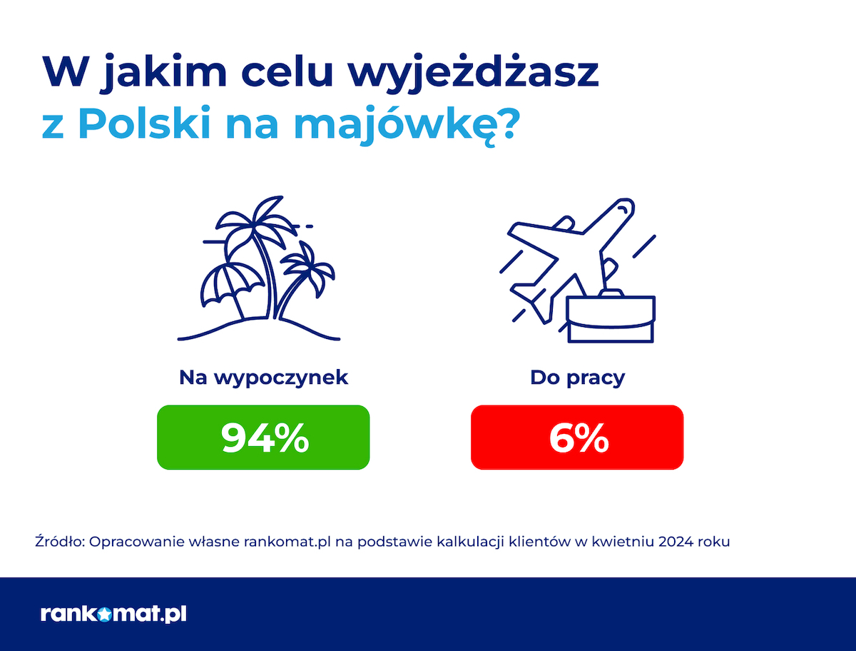 Majówka w 2024 roku ma być rekordowa pod względem zagranicznych wyjazdów – z Polski planuje wyjechać o 25 proc. osób więcej niż przed rokiem. Włochy i Hiszpania to najpopularniejsze kierunki wiosennych wyjazdów. 94 proc. wyjeżdżających w tym czasie decyduje się na wypoczynek, a tylko 6 proc. jedzie do pracy.