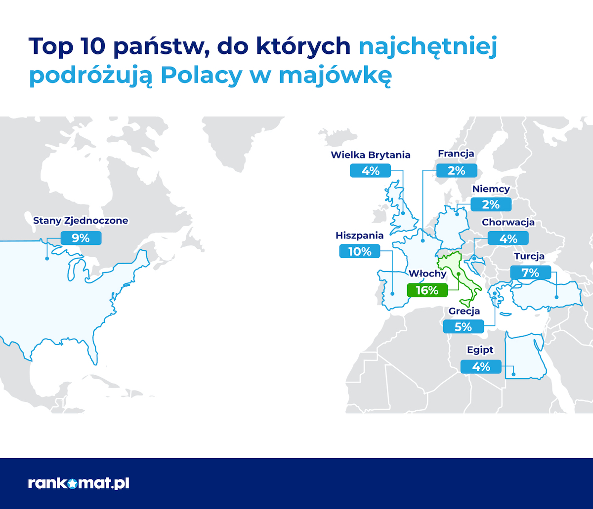 Eksperci rankomat.pl sprawdzili, że wśród osób, które zdecydowały się kupić ubezpieczenie turystyczne, to Włochy cieszą się największą popularnością – zamierza się tam wybrać 16 proc. Polaków wyjeżdżających za granicę na majówkę. Na drugim miejscu jest Hiszpania (10 proc.), a na najniższym miejscu podium znalazły się, co ciekawe, Stany Zjednoczone. Na majówkę do USA planuje się wybrać 9 proc. osób.