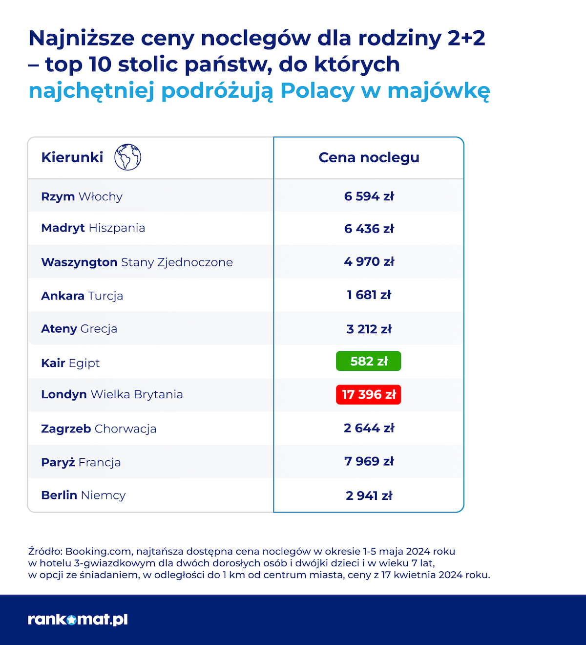 Najtańszy jest Kair, gdzie majówkowy weekend we dwoje można spędzić nawet za 305 zł. Nieco droższa, ale wciąż tania, jest turecka Ankara – tam pięciodniowy pobyt to koszt rzędu 841 zł. W ulubionym przez Polaków Rzymie za nocleg od 1 do 5 maja trzeba zapłacić co najmniej 4 340 zł. Najdroższa będzie majówka w centrum Londynu – ceny hoteli zaczynają się od 6 274 zł za pięć dni.