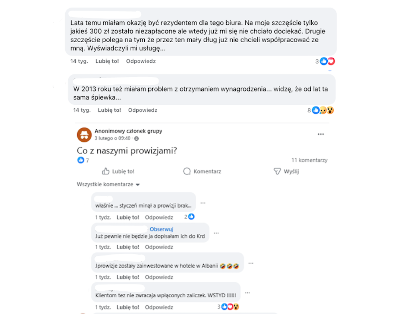 Z informacji przekazywanych przez agentów Rego-Bis wynika, że w odpowiedzi na pojawiające się zarzuty spółka miała stosować m.in. blokowanie krytycznych komentarzy w mediach społecznościowych oraz podważanie roszczeń osób i firm domagających się zapłaty. Według rozmówców redakcji część współpracowników usłyszała od właścicielki biura Rego-Bis, że to oni są stroną zobowiązaną, a ich działania stanowią próbę zniesławienia spółki w internecie.
