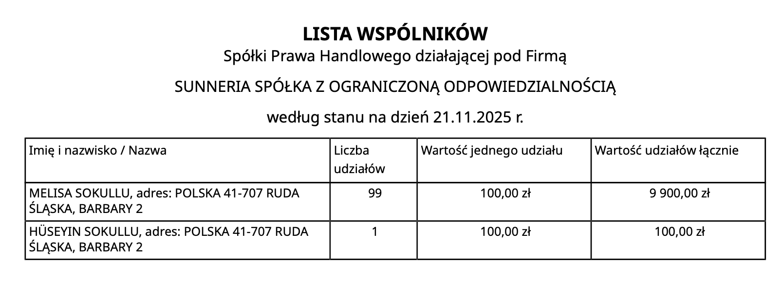 W listopadzie 2025 r. Gabriela Mańka-Sokullu złożyła wniosek o wykreślenie jej z zarządu Rego-Bis spółka z.o.o. Od 26 listopada 2025 r. funkcję prezesa zarządu tej spółki pełni Hüseyin Sokullu, prywatnie mąż pani Gabrieli. Z kolei nowa spółka Sunneria została ona wpisana do Krajowego Rejestru Sądowego 21 listopada 2025 r., a 16 lutego 2026 r. uzyskała wpis do rejestru organizatorów turystyki. Od 24 listopada 2025 r. funkcję prezeski pełni Melisa Sokullu, prywatnie córka pani Gabrieli. Z dokumentów rejestrowych wynika również, że wspólnikiem spółki jest Hüseyin Sokullu.