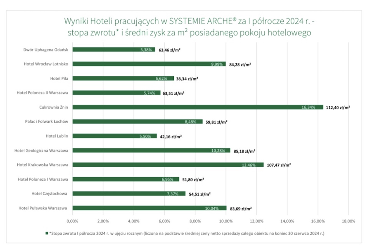„To wszystko dzięki ludziom, mam bardzo dobry zespół i najlepszych dyrektorów. Od lat budujemy taką markę, żeby nasze multifunkcyjne hotele i działania społeczne były rozpoznawalne. Zatrudniamy osoby z niepełnosprawnościami, przyjmujemy uchodźców, inwestujemy w budowę mieszkań chronionych. To jest to, co nas wyróżnia i to procentuje. W hotelarstwie mamy dużo kosztów stałych, więc im są większe przychody, tym szybciej do góry idzie zysk. Promieniuje to na naszych inwestorów, którzy zakupili pokoje w Systemie Arche — dla przykładu łączna kwota wypłacona inwestorom w I półroczu 2024 r., czyli zyski netto to 25,06 mln zł. Mamy też nowe rekordy miesięczne jak w Pałacu i Folwarku Łochów skok w przychodach w czerwcu górę prawie o 2 mln zł rok do roku., czy zysk z metra kwadratowego dla inwestorów na 185 zł we Wrocławiu” – mówi Władysław Grochowski, prezes Arche SA.