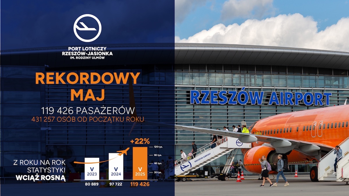 Port Lotniczy Rzeszów-Jasionka im. Rodziny Ulmów zanotował kolejny rekord w historii swojej działalności. W maju 2025 z jego usług skorzystało prawie 120 tys. pasażerów, co oznacza wzrost o ponad 22 proc. względem analogicznego miesiąca ubiegłego roku, który jest efektem rozbudowanej siatki połączeń, atrakcyjnych kierunków wakacyjnych, jak również rosnącego zainteresowania regionem zarówno wśród turystów, jak i podróżujących biznesowo.