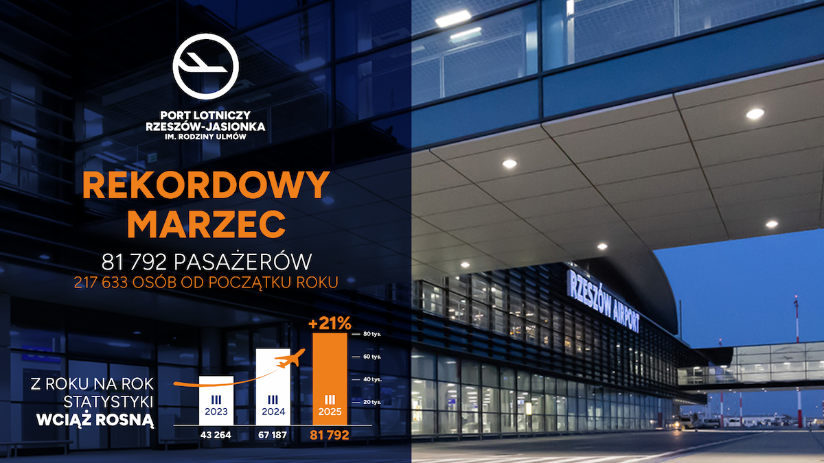 Port Lotniczy Rzeszów-Jasionka im. Rodziny Ulmów zakończył marzec 2025 roku z wynikiem 81 792 obsłużonych pasażerów. Oznacza to wzrost o ponad 21 proc. w porównaniu do analogicznego okresu ubiegłego roku. Od początku roku z usług lotniska skorzystało już ponad 200 tys. podróżnych.