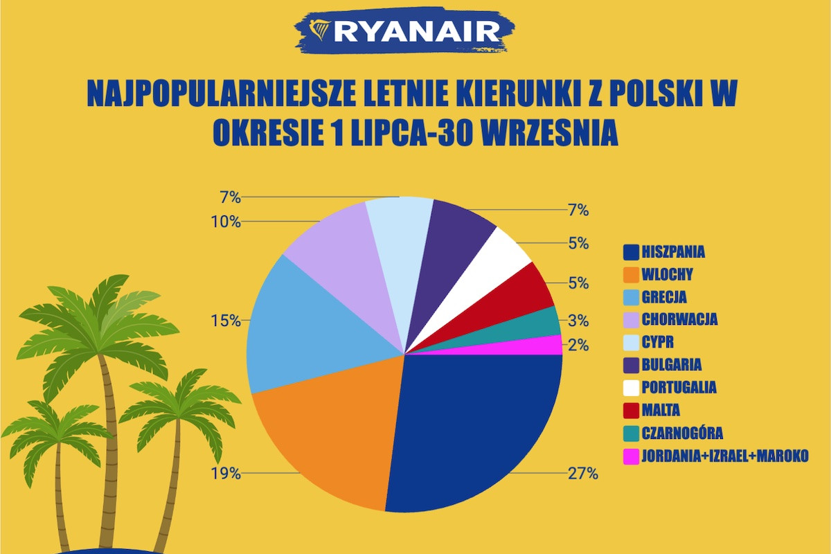 Ryanair podsumował sezon wakacyjny 2023. Na podstawie systemu rezerwacyjnego przewoźnika za okres od 1 lipca do 30 września można zauważyć, że Hiszpania pozostaje ulubionym miejscem wakacyjnym Polaków, stanowiąc 27 proc. wszystkich wyjazdów.