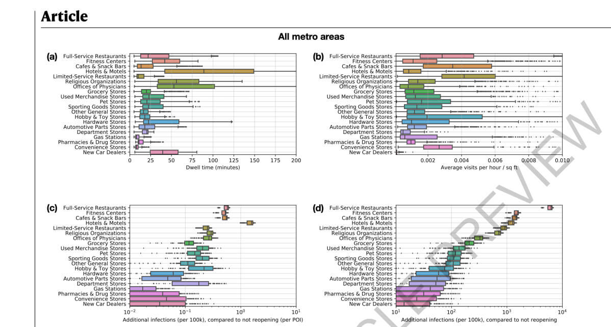 Dane te pozyskano z telefonów komórkowych, mapując sposób przemieszczenia się 98 milionów ludzi do różnych punktów „zainteresowania”, takich jak restauracje i instytucje religijne. Połączono 57 tys. skupisk ludzkich z 553 tys. punktami. Badanie prezentuje sposób rozprzestrzeniania się wirusa w Chicago, Atlancie, Miami, Dallas, Houston, Los Angeles, Nowym Jorku, Filadelfii, San Francisco i Waszyngtonie. Określ m.in. ryzyko wystąpienia dodatkowych infekcji na 100 tys. osób w różnych typach punktów usługowych po ich ponownym otwarciu. W hotelach wynosi ono ok. 1 proc.