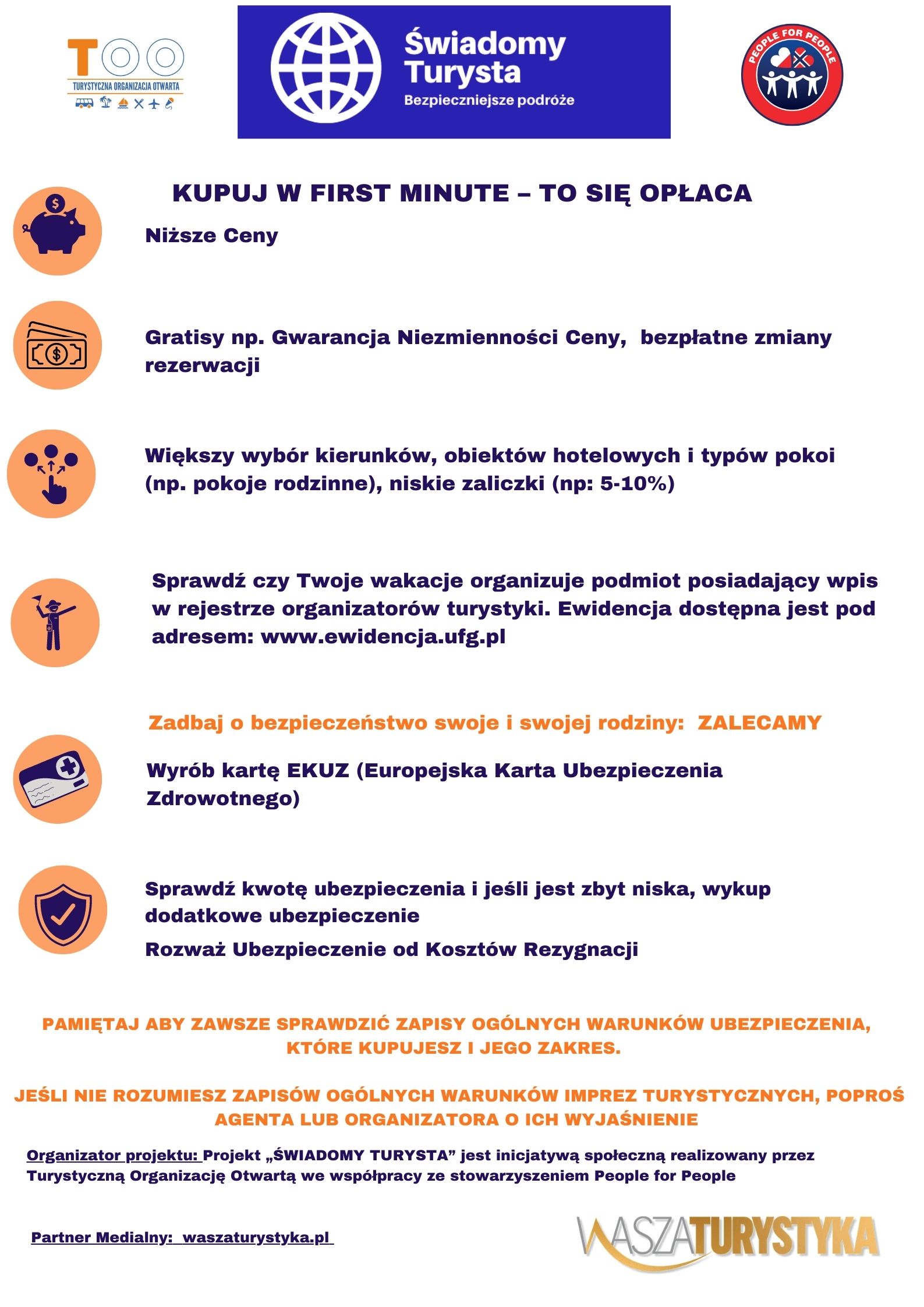 We wspólnym interesie jest, aby turysta decydował się na wybór oferty w sprzedaży first minute – co daje mu wymierną korzyść w postaci dużo większej możliwości wyboru obiektów hotelowych oraz kierunków. Wielokrotnie organizator zostaje postawiony w sytuacji niekomfortowej, gdy klient – szczególnie rodzinny wyraża swoje niezadowolenie ze względu na brak odpowiednich pokoi na dwa tygodnie przed wylotem.