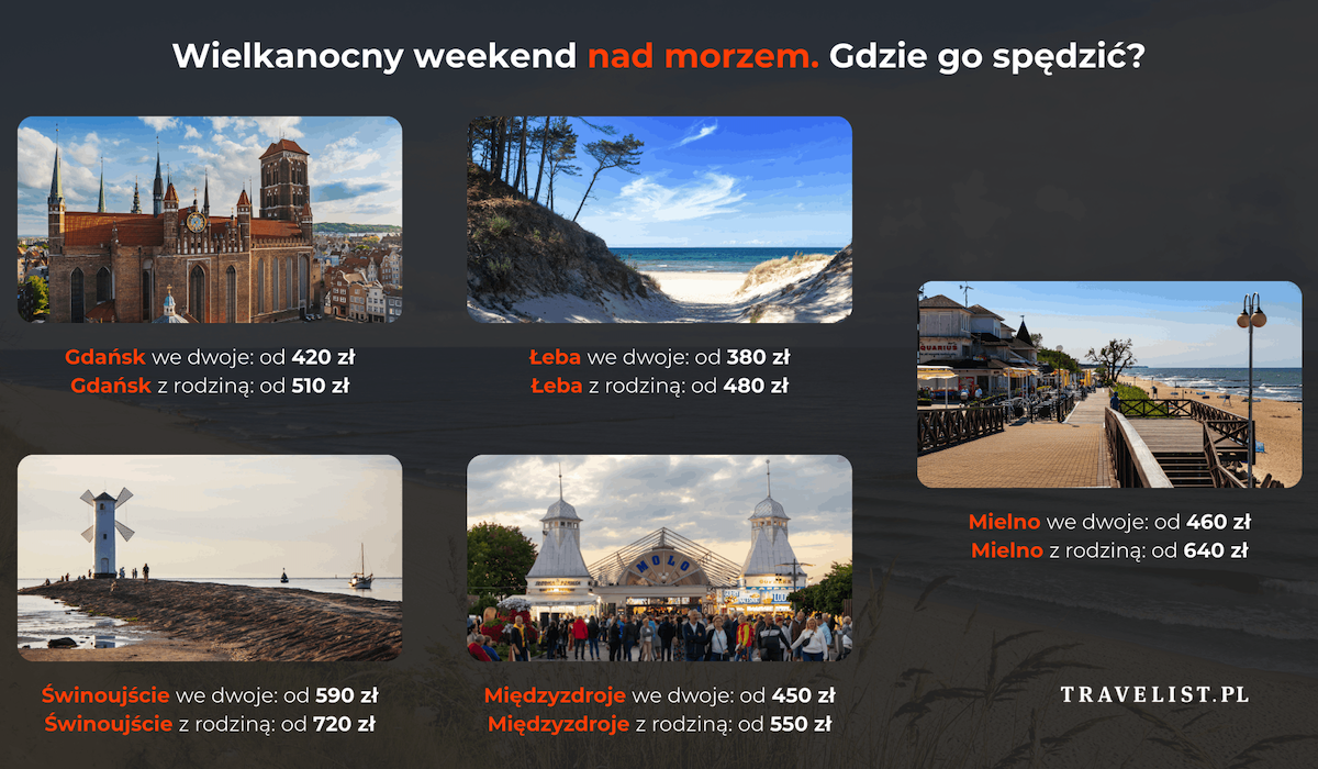 Zestawienie nadmorskich kierunków przygotowane przez Travelist otwiera Gdańsk. Wiosną miasto nabiera uroku – przy Motławie pojawiają się spacerowicze, a kawiarniane ogródki znów wypełniają się gośćmi. W weekend wielkanocny organizowane są także kiermasze i specjalne wydarzenia, które potęgują świąteczną atmosferę. Będąc w Gdańsku, warto oczywiście wybrać się nad morze, a także skorzystać z bogatej oferty atrakcji kulturalnych i edukacyjnych. Ceny noclegów z wyżywieniem w stolicy Pomorza zaczynają się od 420 zł za pobyt dla pary oraz od 510 zł w przypadku rodziny.