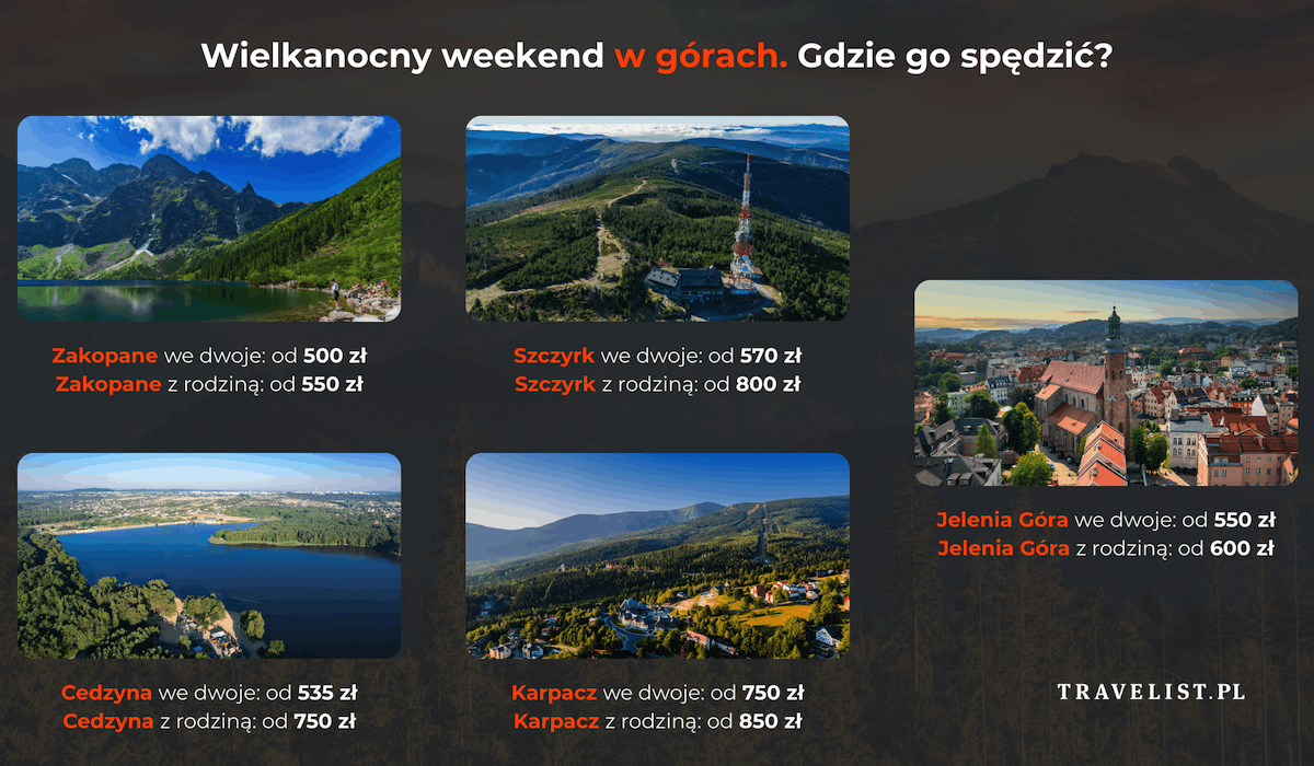 Travelist uwzględnił w zestawieniu także Karpacz. To propozycja dla osób, które chcą połączyć wielkanocną atmosferę z górskim klimatem i szeroką ofertą atrakcji dostępnych przez cały rok. Wczesną wiosną karkonoskie szlaki są mniej zatłoczone niż latem, dzięki czemu w komfortowych warunkach można odwiedzić m.in. Świątynię Wang, Wodospad Kamieńczyka czy wybrać się trasą w kierunku Śnieżki. Ofertę uzupełniają hotele z rozbudowanym zapleczem rekreacyjnym, w tym strefami wellness i basenami. Ceny pobytów zaczynają się od 750 zł za noc dla pary oraz od 850 zł w przypadku rodziny z dzieckiem.