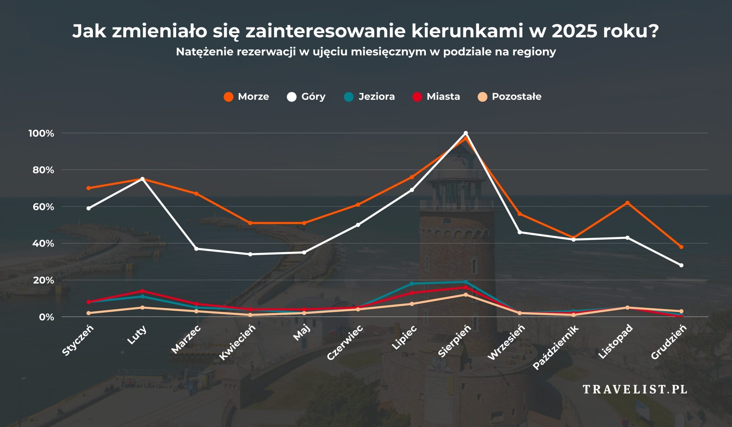 Z danych portalu Travelist wynika, że w 2025 roku Polacy wciąż najchętniej wyjeżdżali w wakacje i ferie, ale coraz częściej podróżowali także poza szczytem sezonu. Szczególnie wzrosło znaczenie czerwca, a góry po raz pierwszy od lat wyprzedziły Bałtyk pod względem liczby rezerwacji.