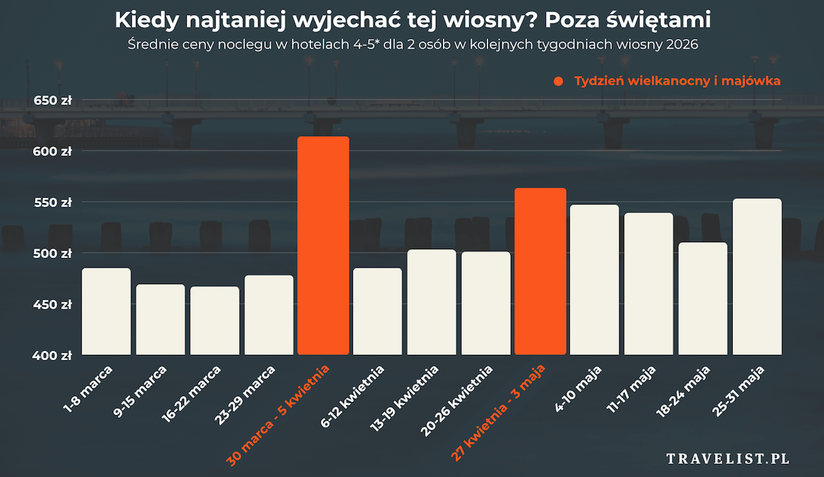 Analizę przygotowano na podstawie rezerwacji hotelowych w serwisie Travelist.pl, które obejmują pobyt między 1 marca a 31 maja 2026 r. Zaprezentowane ceny noclegów to koszt jednej doby hotelowej ze śniadaniem lub wyżywieniem dla dwóch osób dorosłych w hotelu o standardzie 4-5* lub równorzędnym.