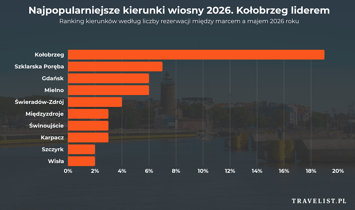 Wśród nadmorskich miejscowości królują Kołobrzeg, Mielno i Gdańsk. Rośnie również zainteresowanie Niechorzem, Krynicą Morską i Władysławowem. W górach liderami pozostają Szklarska Poręba, Świeradów-Zdrój i Karpacz, a największą dynamikę wzrostu notują Biały Dunajec, Białka Tatrzańska i Bielsko-Biała. Z kolei nad jeziorami najczęściej wybierane są Ostróda, Żnin i Koprzywnica, a wśród miast zwycięża Kraków, Wrocław i Warszawa.
