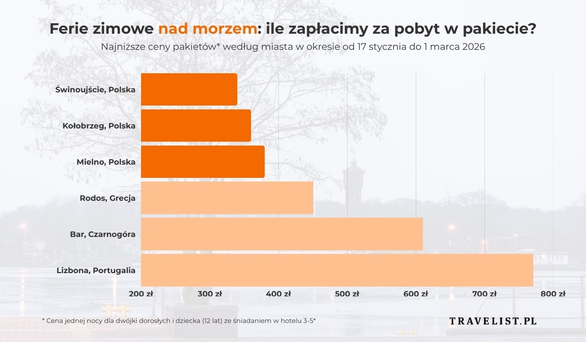 Alternatywą dla górskich wyjazdów pozostają zimowe ferie nad morzem. W Polsce najczęściej wybierane są Kołobrzeg – 360 zł, Świnoujście – 340 zł oraz Mielno – 380 zł. Coraz większym zainteresowaniem cieszą się także zagraniczne kierunki nadmorskie. W Grecji, na wyspie Rodos, rodzinny pobyt ze śniadaniem dostępny jest od 450 zł za noc. W Lizbonie ceny zaczynają się od 770 zł, natomiast w czarnogórskim Barze od 610 zł za noc dla rodziny z dzieckiem.