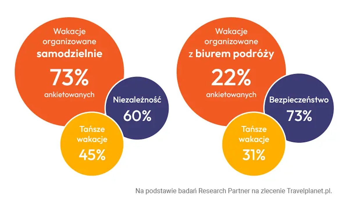 Czy wyjazd zorganizowany samodzielnie jest tańszy od oferty biura podróży? Każdy może to sprawdzić we własnym zakresie, ale, jak wynika z badań społecznych przeprowadzonych zeszłej wiosny przez Travelplanet.pl, to mało istotny czynnik. Spośród ankietowanych, którzy byli zdecydowani na samodzielnie zorganizowane wakacje mniej niż połowa (45 proc.) wskazywała, że będą one tańsze zaś prawie 60 proc. wskazywało, że takie rozwiązanie zapewnia niezależność w trakcie urlopu.