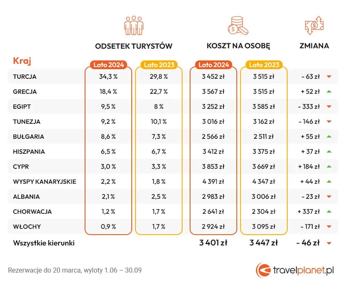 Według statystyk Travelplanet.pl rezerwacji w biurach podróży jest o ok. 1/3 więcej niż w porównywalnym okresie 2023. Wakacje są przeciętnie minimalnie tańsze niż rok temu – teraz za zagraniczną eskapadę, najczęściej na osiem dni, do dobrego hotelu (czterogwiazdkowy – 45 proc. rezerwacji, pięciogwiazdkowy – 35 proc. rezerwacji) z wyżywieniem all inclusive (85 proc. rezerwacji) turyści płacą ok. 3,4 tys. zł za osobę.
