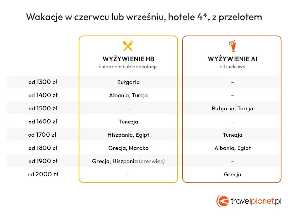 Przed i po wysokim sezonie, a więc w czerwcu lub wrześniu, można przebierać w ofertach, których cena nie przekracza 2 tys. zł – mowa tu o wypoczynku z przelotem do hotelu czterogwiazdkowego i wyżywieniu HB (śniadania i obiadokolacje) oraz all inclusive. Za takie, a nawet znacznie mniejsze pieniądze, bo już od 1300 – 1400 zł wypoczniemy w Bułgarii, Turcji, Albanii. Nieco więcej kosztują takie wakacje w Tunezji, Egipcie, Maroku, Grecji i Hiszpanii. W tym czasie nad Bałtykiem za pobyt z wyżywieniem HB trzeba zapłacić co najmniej 1100 zł i doliczyć do tego koszt dojazdu.