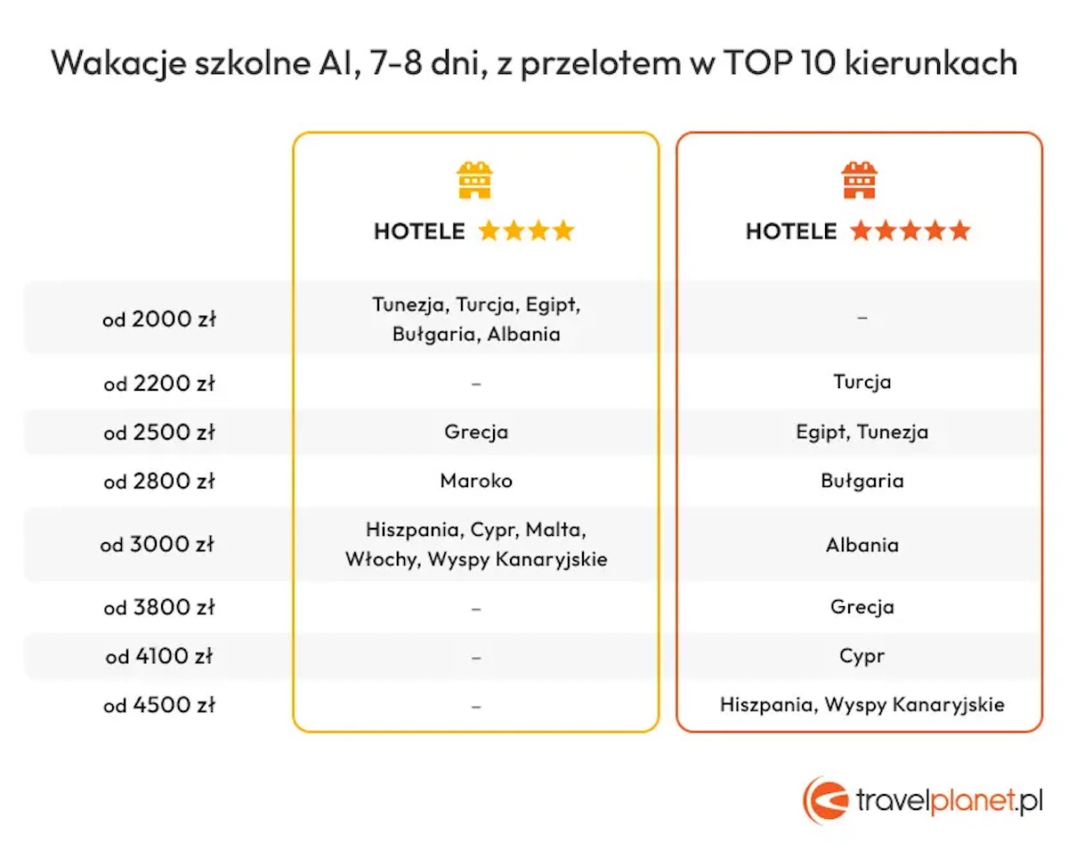 Ale za tygodniowy urlop w szczycie letniego sezonu (lipiec – sierpień), można zapłacić równie dobrze co najmniej 4,5 tys. zł od osoby, jeśli celem będzie Hiszpania lub Wyspy Kanaryjskie w hotelu pięciogwiazdkowym z wyżywieniem all inclusive.