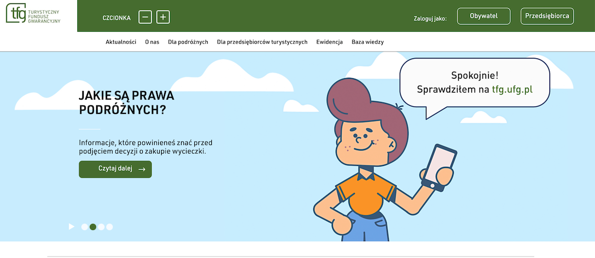 Na stronie Turystycznego Funduszu Gwarancyjnego tfg.ufg.pl można bezpłatnie i bez konieczności logowania się znaleźć informacje na temat przedsiębiorców turystycznych. Przede wszystkim sprawdzimy w ten sposób, czy wybrana przez nas firma posiada wymagany prawem wpis do rejestru oraz zabezpieczenie na wypadek niewypłacalności.