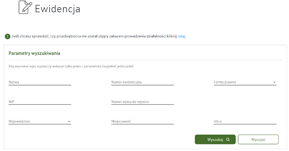 Firmę można wyszukać w ewidencji po różnych danych, np. po nazwie lub NIP-ie. Jeśli wyszukujemy firmę po nazwie, to należy podać nazwę rejestrową (znajdziemy ją np. w umowie), która może się różnić od marki handlowej. To samo odnosi się do miejscowości – należy wpisać tę, w której firma jest zarejestrowana. Jeśli nie mamy tej informacji, możemy nic nie wpisywać. Wystarczy wypełnić jedno pole, by system wyświetlił wyniki pasujące do wyszukiwanych danych.