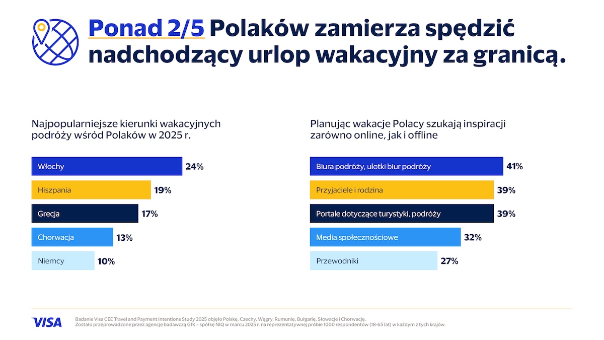O 10 proc. więcej osób niż w ubiegłym roku zamierza spędzić tegoroczne wakacje poza krajem – najczęściej wybierając Włochy, Hiszpanię i Grecję. Większość zorganizuje wyjazd samodzielnie, choć 2 na 5 konsumentów zdecyduje się na wakacje z biurem podróży. W obu przypadkach najczęściej skorzystają z kanałów online do zakupu usług i zapłacą cyfrowo. Samodzielne planowanie i rezerwowanie wyjazdów cieszą się szczególną popularnością wśród mieszkańców Węgier i Bułgarii.