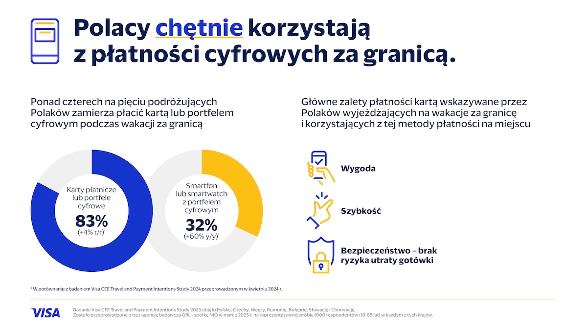Badanie Visa pokazuje, że płatności cyfrowe stają się dla Polaków codziennością zarówno w kraju, jak i podczas zagranicznych podróży. Ponad 4 na 5 polskich turystów deklaruje, że będąc na wakacjach w innym kraju będzie płacić kartą, smartfonem lub smartwatchem (wzrost o 4 proc. rok do roku). Szczególnie dynamicznie rośnie popularność portfeli mobilnych – o 60 proc. w ujęciu rocznym. Dla jednej trzeciej Polaków to dziś preferowana metoda płatności podczas zagranicznych wyjazdów. Korzystanie z kart Visa umożliwia szybkie i bezpieczne płatności w ponad 150 milionach punktów handlowych na terenie 200+ państw i terytoriów zależnych, w przeszło 180 walutach. Znaczenie tych aspektów podkreślają również podróżni z regionu CEE – najczęściej wskazując na wygodę (64 proc.), szybkość (61 proc.) i bezpieczeństwo (55 proc.) jako główne zalety płacenia kartą za granicą.