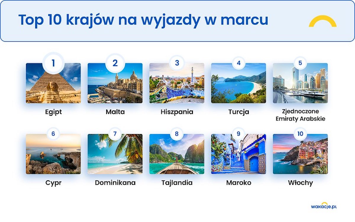 Marzec to miesiąc, kiedy pogoda w Polsce jest jeszcze dość kapryśna, dlatego turyści chętnie wybierają się na poszukiwanie słońca. Nie zawsze chodzi jednak o typowy wypoczynek na plaży. Jak pokazuje analiza Wakacje.pl, na pierwszym miejscu w tym okresie najczęściej wybierany jest co prawda Egipt, ale tuż za nim znajduje się Malta, a dalej Hiszpania i Turcja, które dobrze sprawdzają się w tym czasie na aktywne wakacje. Pierwszą piątkę zamyka inny „gorący” kierunek – Zjednoczone Emiraty Arabskie.