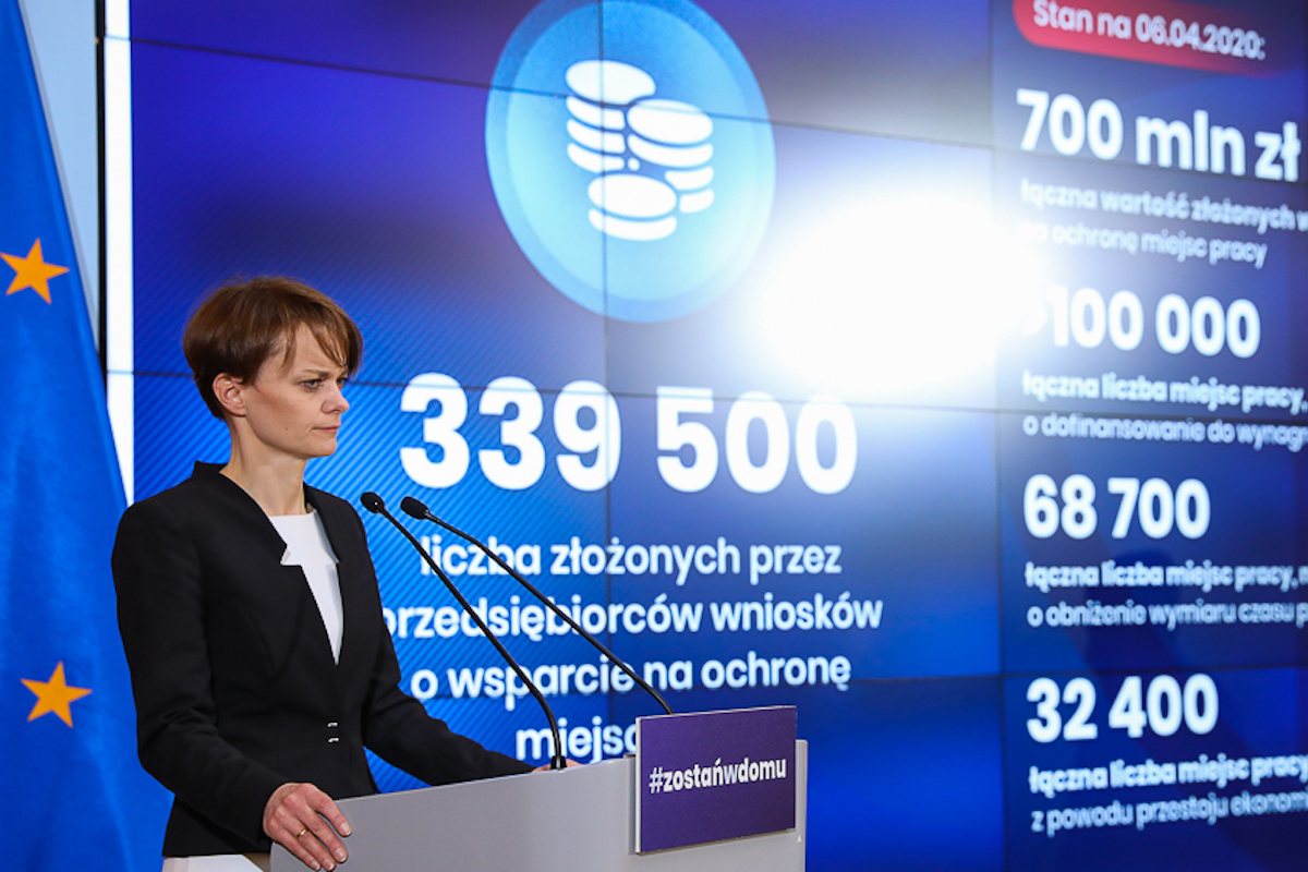 Ulga 50 proc. składki na ZUS dla firm do 49 pracowników, kredyty z BKG i przymusowe urlopy. Poprawki do tarczy antykryzysowej przedstawiła podczas konferencji prasowej minister rozwoju Jadwiga Emilewicz. Dziś projektem rządowym ma zająć się Sejm.