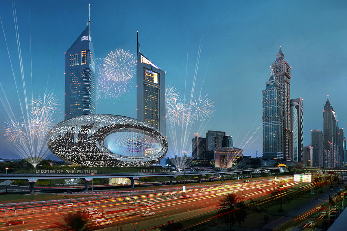 Budynek Muzeum Przyszłości położonego przy Sheikh Zayed Road, obok Emirates Towers, nie podparty przez żaden filar, jest wykonany z włókna szklanego i stali nierdzewnej. Długo oczekiwane otwarcie obiektu już 22 lutego br.
