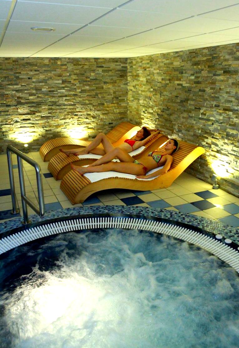 Poniżej znajduje się strefa saun (pięć saun), do dyspozycji gości są również kawiarnia basenowa, klub fitness, SPA, kręgielnia. Obok – restauracja hotelowa.