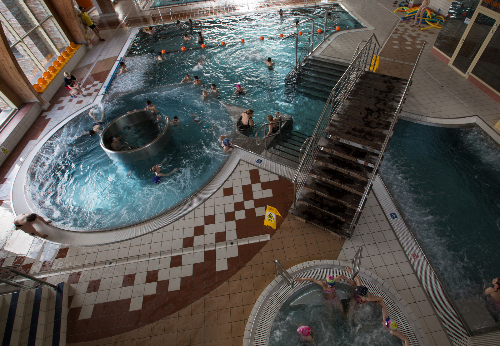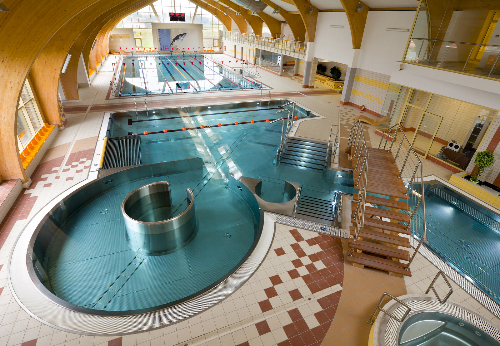 Aquapark oferuje basen sportowy z sześcioma torami o wymiarach 25 na 12,5 metra. Obok, to co cieszy przede wszystkim rodziny z dziećmi – owalny o nieregularnym kształcie basen rekreacyjny z biczami wodnymi, gejzerem, „łóżkami” wodnymi i sztuczną rzeką. Tuz obok obszerne jacuzzi. Przebojem jest zjeżdżalnia o długości 86 metrów. Dla najmłodszych, w oddzielnej sali – brodzik i zjeżdżalnia. Temperatura wody w strefie malucha: 33⁰C-34⁰C.