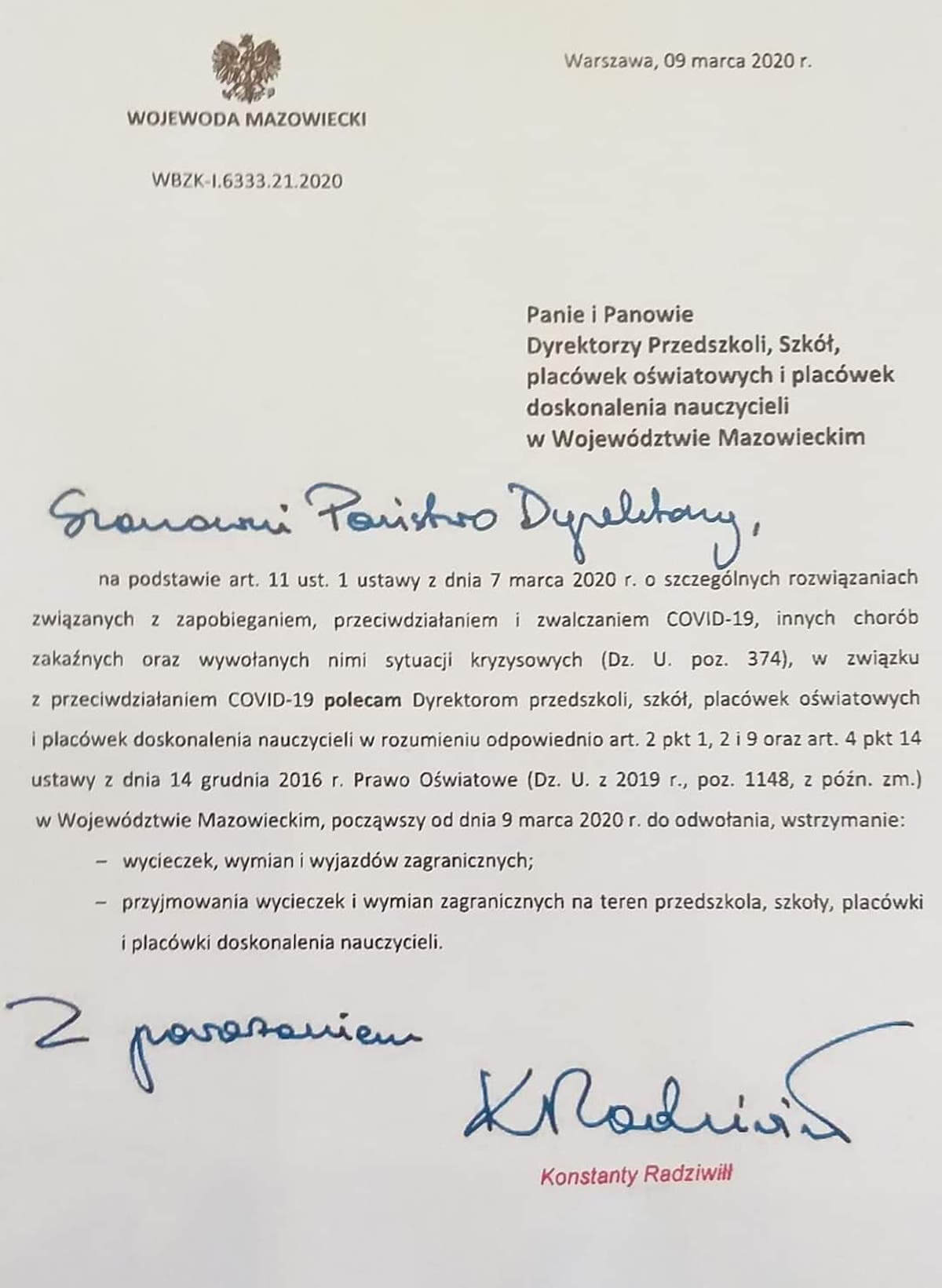 Konstanty Radziwiłł, wojewoda mazowiecki rozesłał pismo do wszystkich dyrektorów szkół, przedszkoli, placówek oświatowych na Mazowszu, w którym wydał polecenie wstrzymania: wycieczek, wymian i wyjazdów zagranicznych do odwołania.