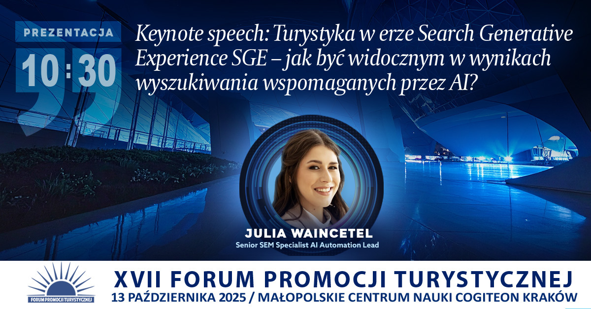 13 października w Małopolskim Centrum Nauki Cogiteon odbędzie się XVII edycja Forum Promocji Turystycznej. Wśród prelegentów znajdzie się Julia Waincetel, Senior SEM Specialist AI Automation Lead, która opowie o turystyce w erze Search Generative Experience (SGE) jak być widocznym w wynikach wyszukiwania wspomaganych przez AI?