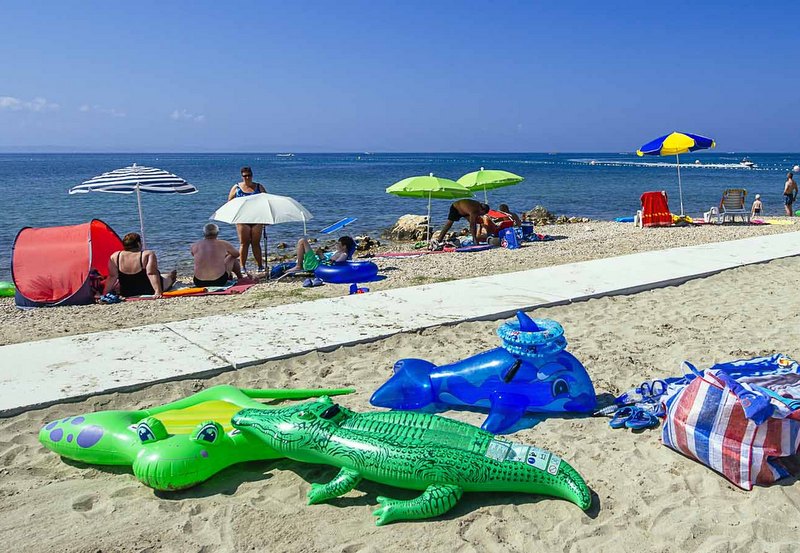 Teren jest zadbany, alejki i trawniki czyste. Podobnie plaże. A te są tutaj dwie: jedna z typowym, kojarzonym z Chorwacją, podłożem za kamyczków i druga – piaszczysta. Plaża campingu posiada Błękitną Flagę. Komu mało wody morskiej, ma do dyspozycji baseny.