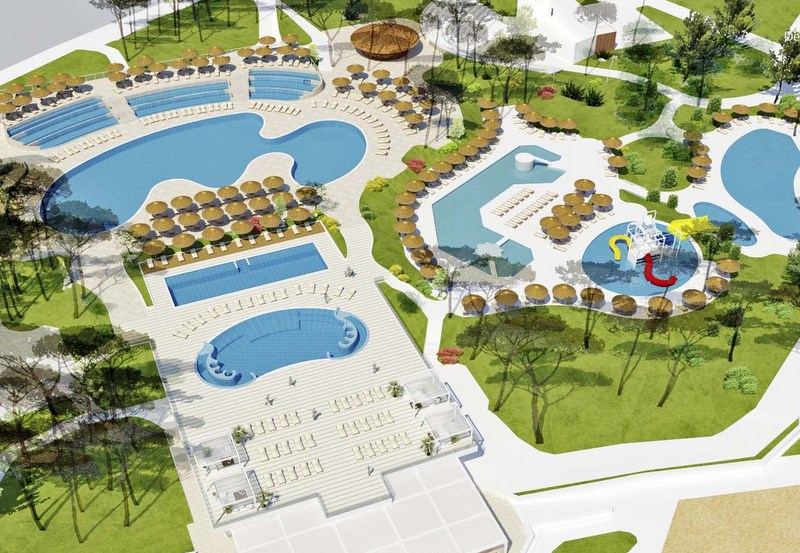 Znajdują się tutaj 2 odnowione baseny pływackie (basen dla dorosłych o powierzchni 825 metrów kwadratowych i głębokości 1,30 m oraz basen dla dzieci o powierzchni 340 metrów kwadratowych i głębokości 30 cm. Są tu też trzy baseyny z hydromasażem i kolejne dwa baseny dla małych dzieci. Baseny znajdują się na tarasie z widokiem na zatokę i plażę.