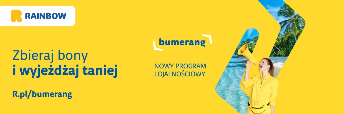 Rainbow uruchamia nowy program lojalnościowy „Bumerang”, który nagradza klientów za każdą podróż. Zasada jest prosta – im więcej wyjeżdżasz, tym więcej wraca do ciebie. Dzięki programowi można zyskać do 4 proc. wartości wakacji na kolejny wyjazd.